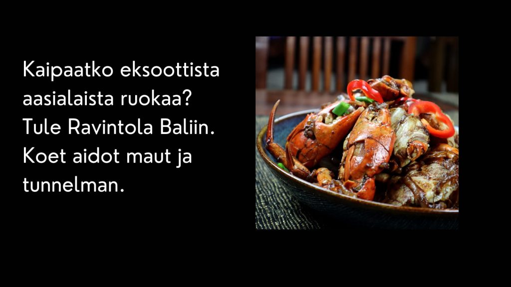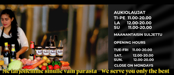 Tervetuloa Ravintola Baliin, joka on aito indonesialainen ravintola Helsingissä Mäkelänkadulla. Tule hemmottelemaan makunystyröitäsi balilaisen kokkimme loihtimilla ruuilla ja koe Bali lautasellasi. Koko henkilökuntamme puolesta lämpimästi tervetuloa, Meiltä onnistuu tarjoilut myös catering palvelumme kautta, niin yksityisille kuin yrityks