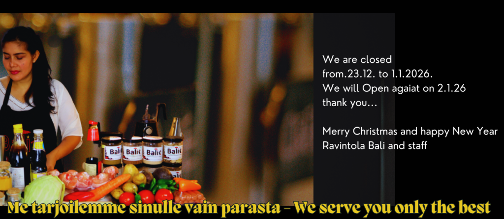 Tervetuloa Ravintola Baliin, joka on aito indonesialainen ravintola Helsingissä Mäkelänkadulla. Tule hemmottelemaan makunystyröitäsi balilaisen kokkimme loihtimilla ruuilla ja koe Bali lautasellasi. Koko henkilökuntamme puolesta lämpimästi tervetuloa, Meiltä onnistuu tarjoilut myös catering palvelumme kautta, niin yksityisille kuin yrityks